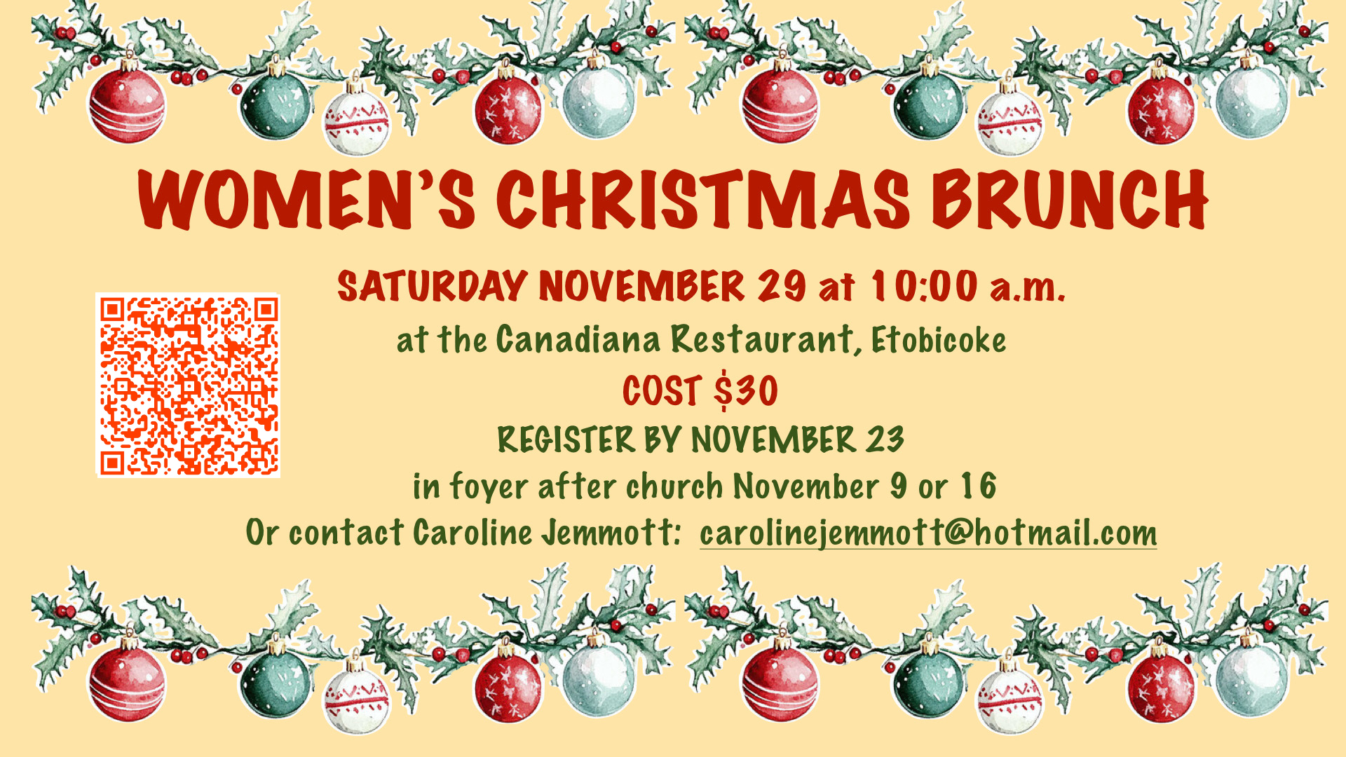 Women, mark your calendars for Saturday Nov 29th at 10 am! Whether or not you have attended our monthly meetings, we invite you to a delicious brunch at the Canadiana Restaurant located in the Six Points Plaza in Etobicoke. You will enjoy guest speaker Lisa Bynoe-Stevens and a guest soloist, Dr. Melissa Davies. There will be plenty of time for informal fellowship. Tickets are $30 and can be purchased at the table in the foyer after the service, or by using the QR code on the announcment. The deadline for purchasing the tickets is Nov 23rd, so don't delay!
